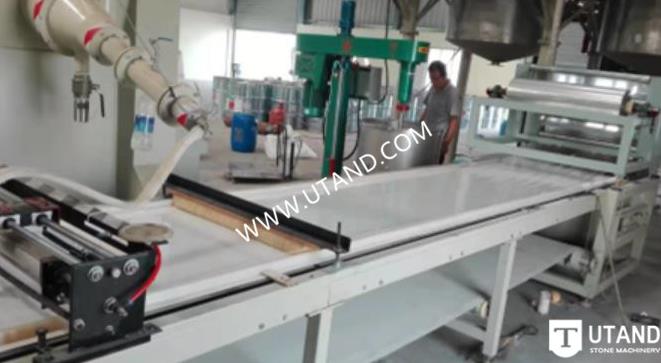 make engineered stone first step mix the fillers with different mesh numbers according to the required proportion, remix them with the resin added with medium temperature initiator and color paste, and pump them to the hopper at the upper part of the pouring machine for mixing.